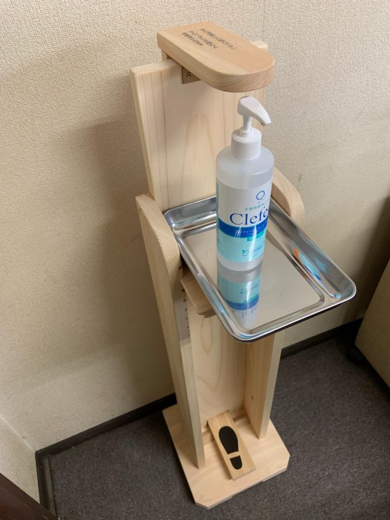 昨日取引業者様から木製の足踏式消毒液スタンドをいただきました。